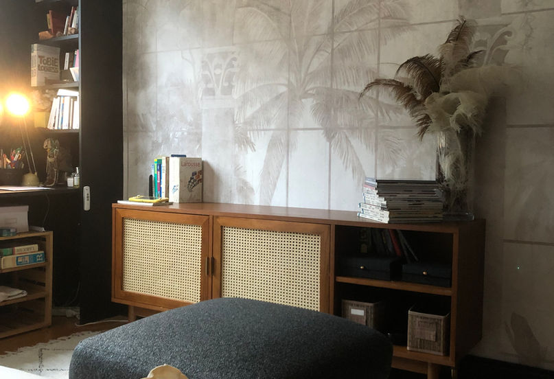 Pour insuffler âme et singularité à cet intérieur, un papier peint panoramique soigneusement sélectionné dialogue avec le mobilier sombre. Véritable œuvre murale, il crée un effet de profondeur immersif tout en ancrant la pièce dans une ambiance cocooning et lumineuse — un équilibre rare entre caractère affirmé et douceur de vivre.